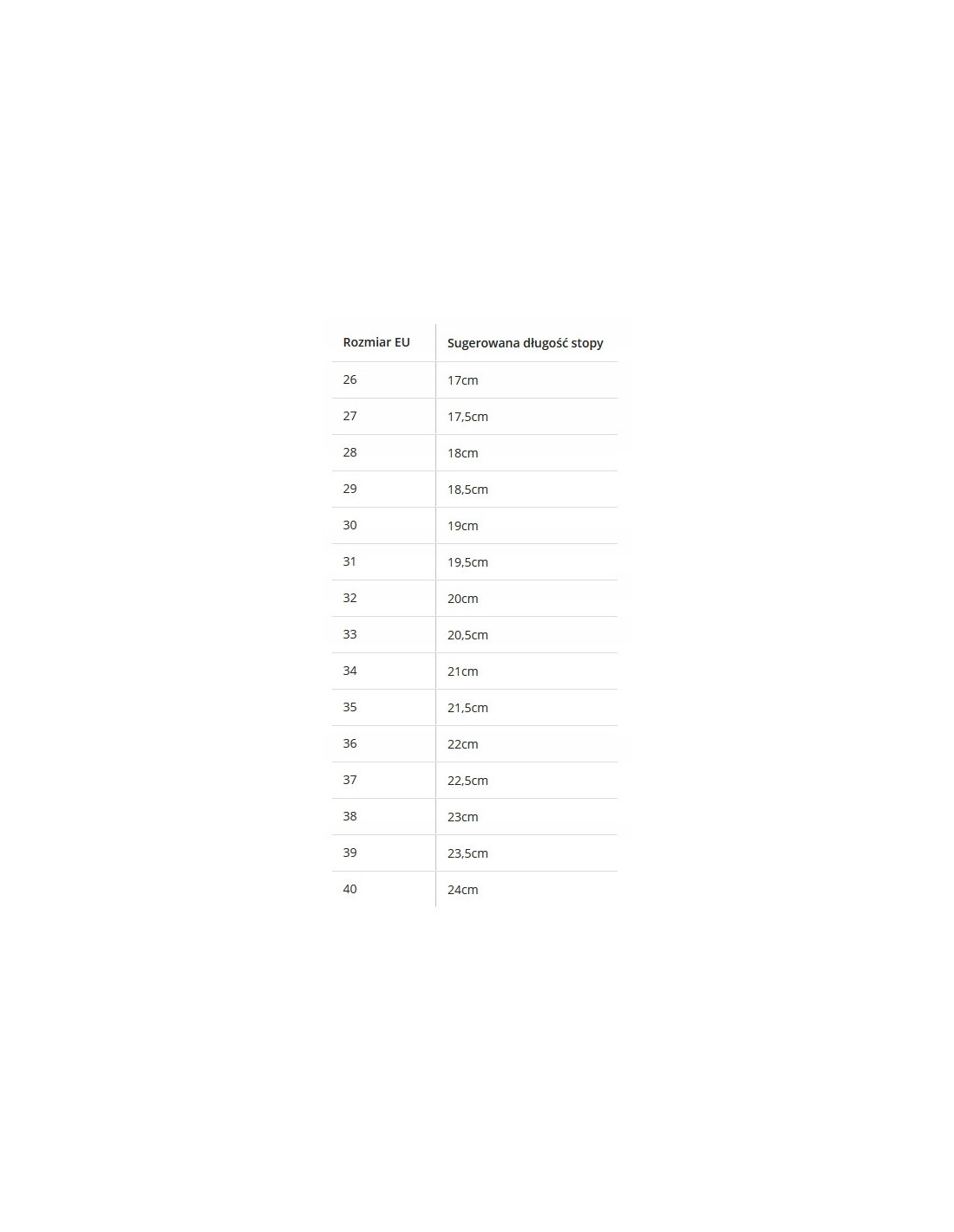- Przy wyborze rozmiaru prosimy kierować się długością wkładki, ponieważ rozmiarówka buta jest delikatnie zaniżona.