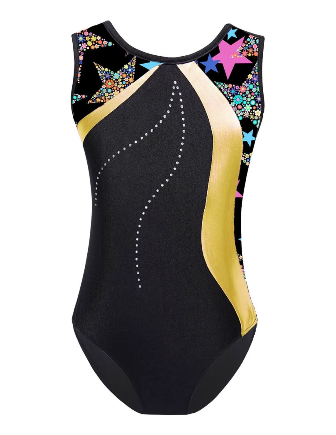 ✅ Body gimnastyczne – czarne z kolorowym wzorem w gwiazdki, ozdobione błyszczącymi kryształkami i żółtymi wstawkami, które nadają mu nowoczesny i energiczny wygląd.