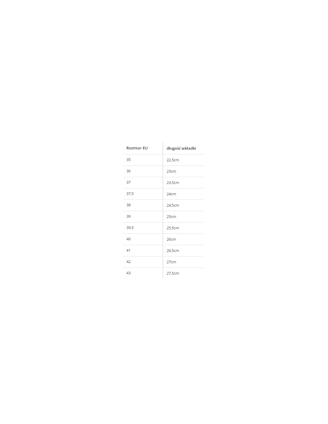Przy wyborze rozmiaru proszę kierować się DŁUGOŚCIĄ WKŁADKI, rozmiarówka jest standardowa.