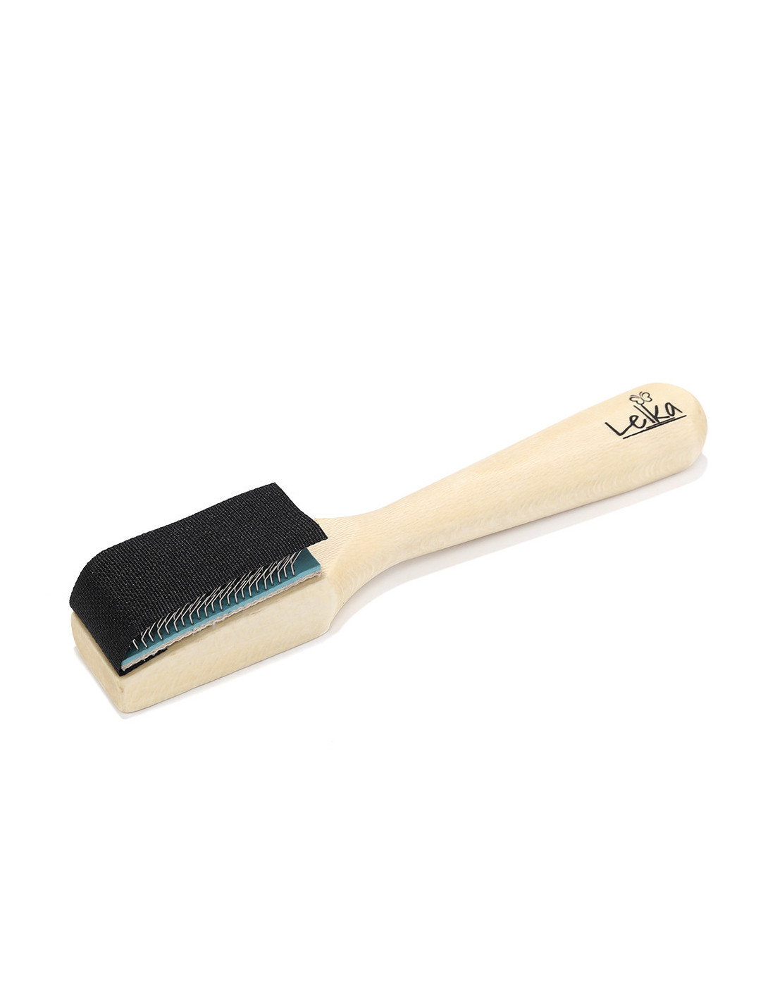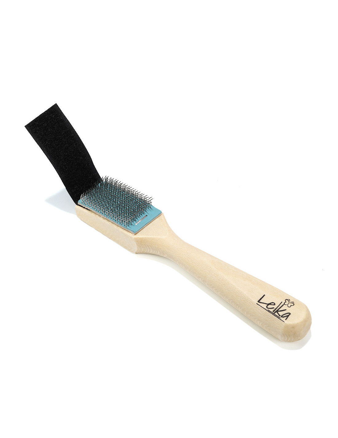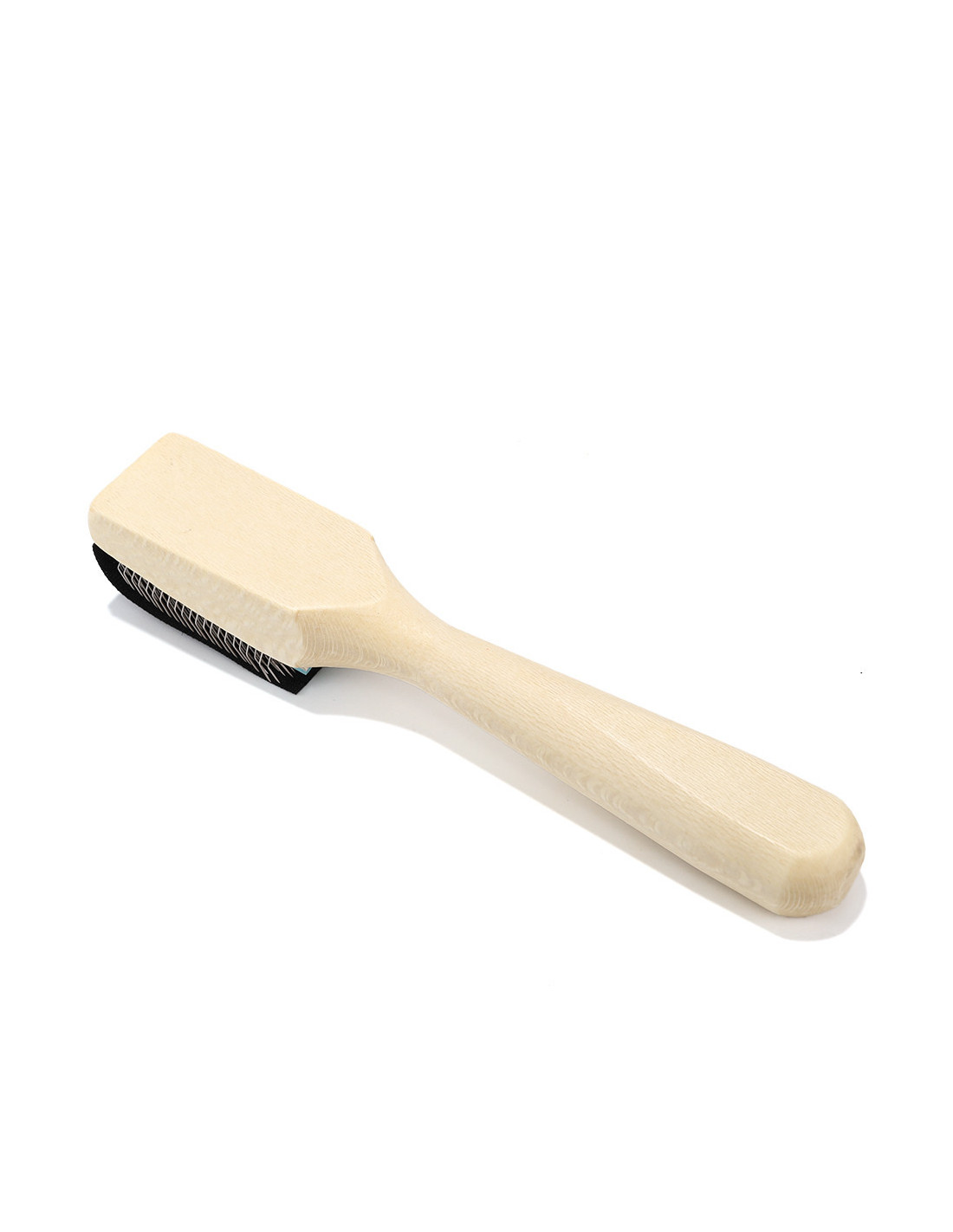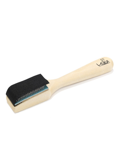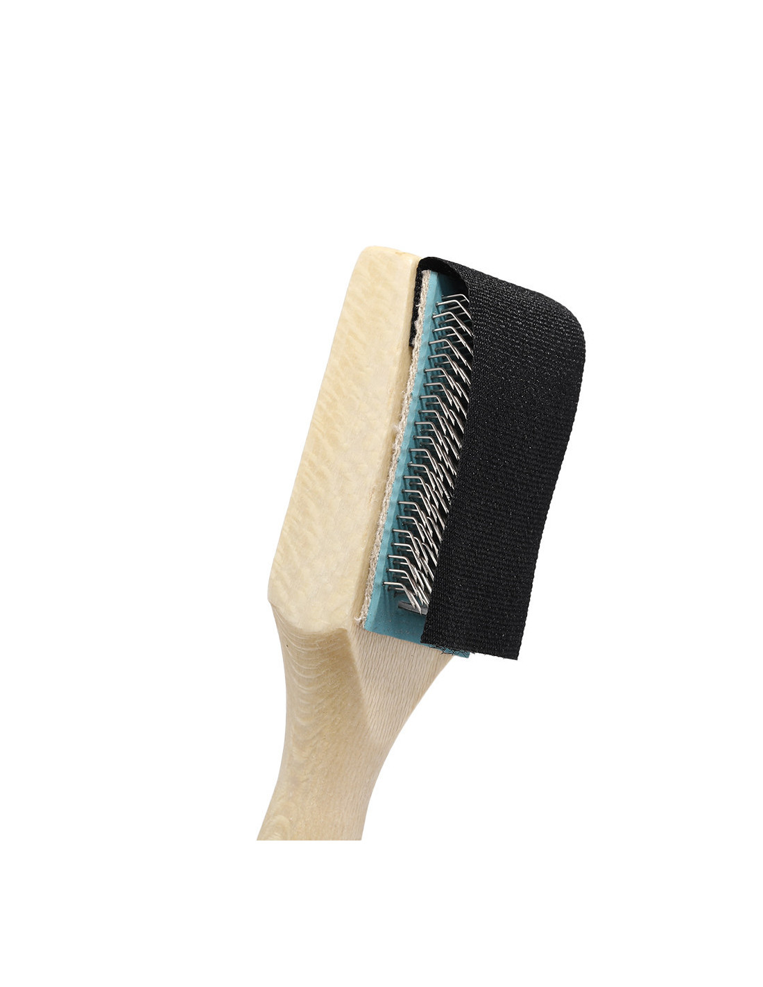 Drewniana szczotka do butów wyposażona w ostre zakrzywione kolce, przeznaczona do wyczesywania skórzanych podeszw butów tanecznych.